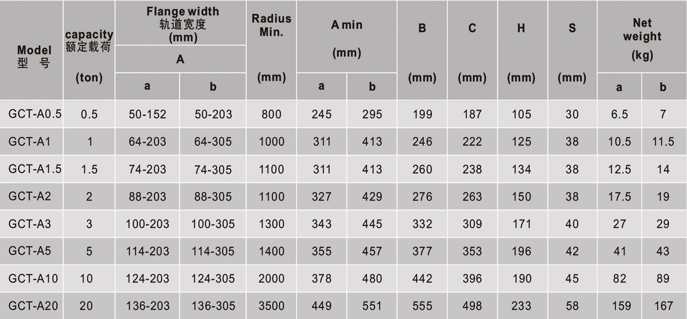 山東五牛GCT-A 手推單軌小車指標(biāo)參數(shù)圖: